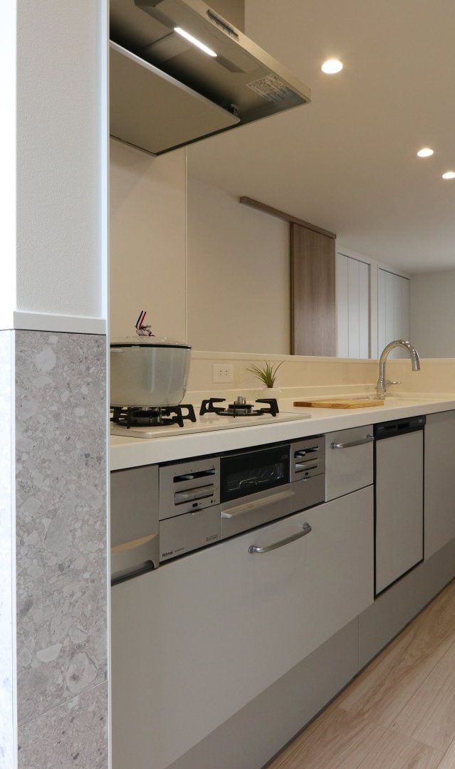やわらかなグレージュヒッコリーの床に、上品なフォググレーのキッチンが調和する落ち着いた空間。