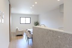 木目の家具がやさしく馴染み、キッチン前のグレータイルが上質なアクセントを添えています。